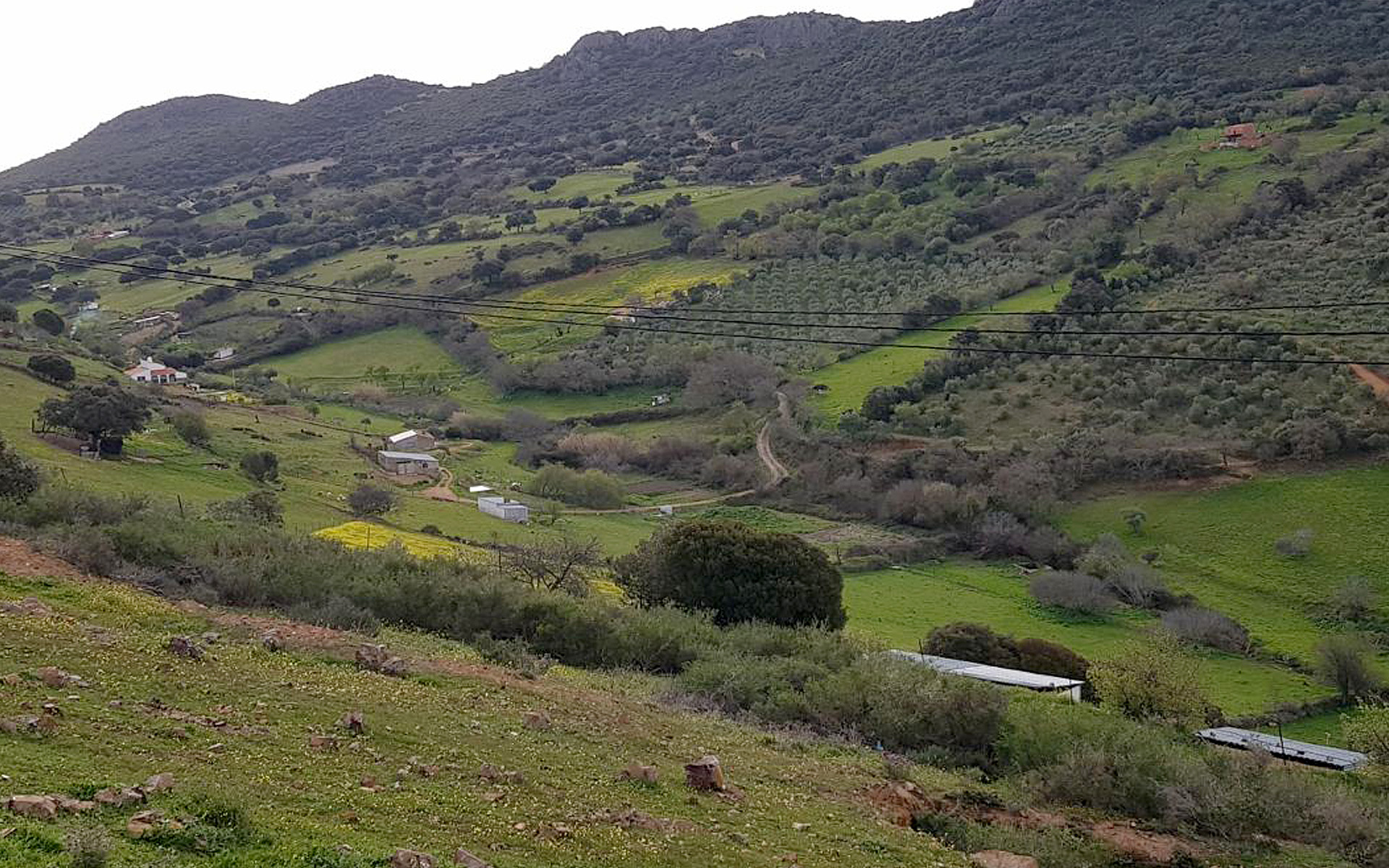 Dejamos atrás el alcornocal y nos encontramos una explotación ganadera con edificios en ruinas. En este punto giraremos a la izquierda e iniciaremos un descenso hacia la carretera CM-424, abandonando la sierra. Desde aquí tenemos excelentes vistas del mar de dehesas y sierras de la comarca hacia el norte.