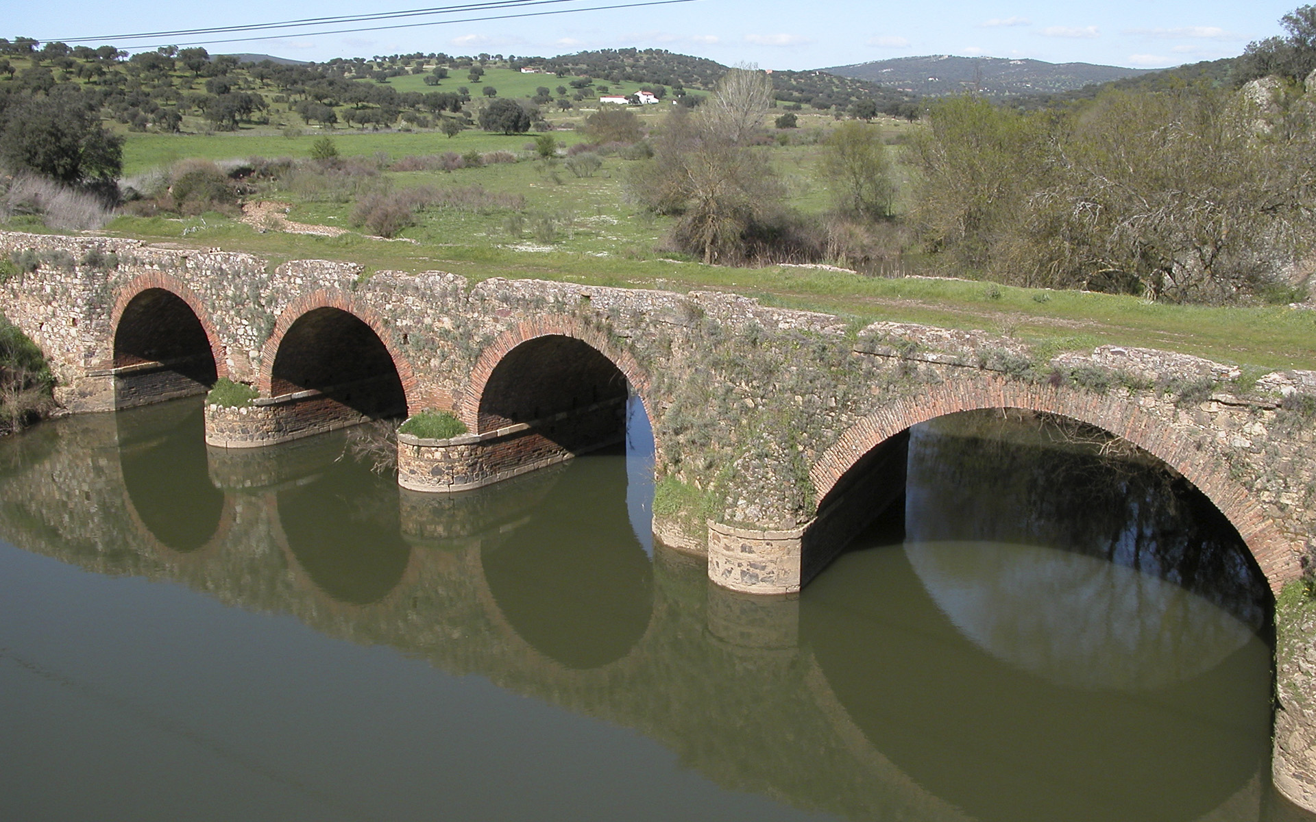 Justo antes de llegar al puente tomaremos el camino que sale a la izquierda (antigua carretera), donde podemos hacer una parada y realizar un recorrido a pie por el puente y observar el río Valdeazogues. Se trata de un puente de cuatro ojos, construido en piedra con arcos de medio punto de ladrillo y tajamares semicirculares.
