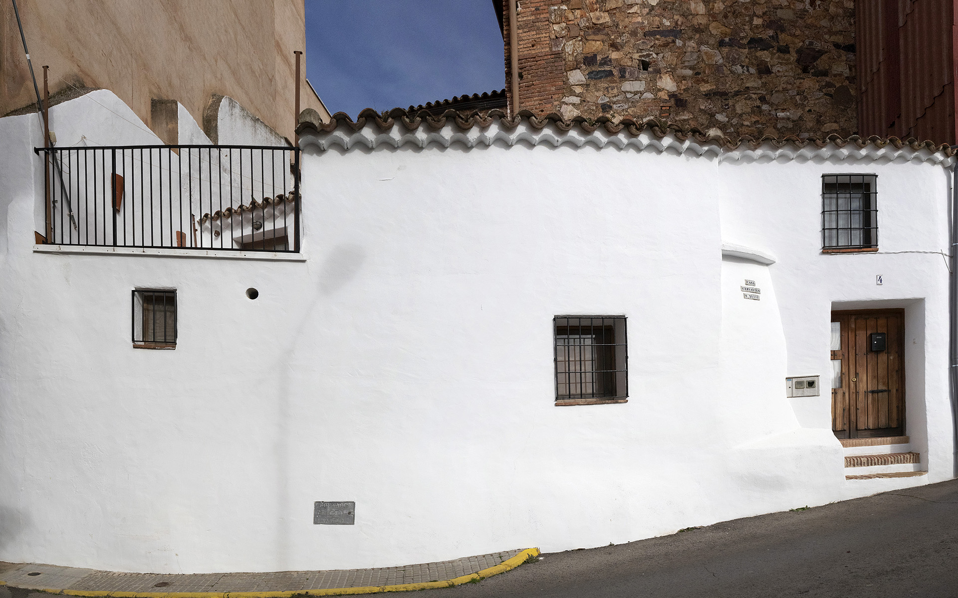 9. Nos adentramos ahora en otra parte del casco histórico, una serie de calles estrechas que recuerdan a las antiguas poblaciones árabes como un pequeño laberinto. Desde la Plaza Escosura nos dirigimos hacia el sur por la calle, la primera calle a la izquierda es Guillermo Sánchez Martín. En ella están los números 2, 12 y 27 como representación de viviendas antiguas. Busca la calle Torno de Castro y continua por la calle Sauco, y comprobarás esa irregularidad geométrica típica de las urbes árabes. Debes haber llegado a la calle Jacinto Benavente, dejando a tu izquierda unas escaleras de subida. Asciende por ellas y al final encontrarás la calle Cervantes, y en su número 4 la vivienda donde se alojó Miguel de Cervantes en su estancia en Almadén.